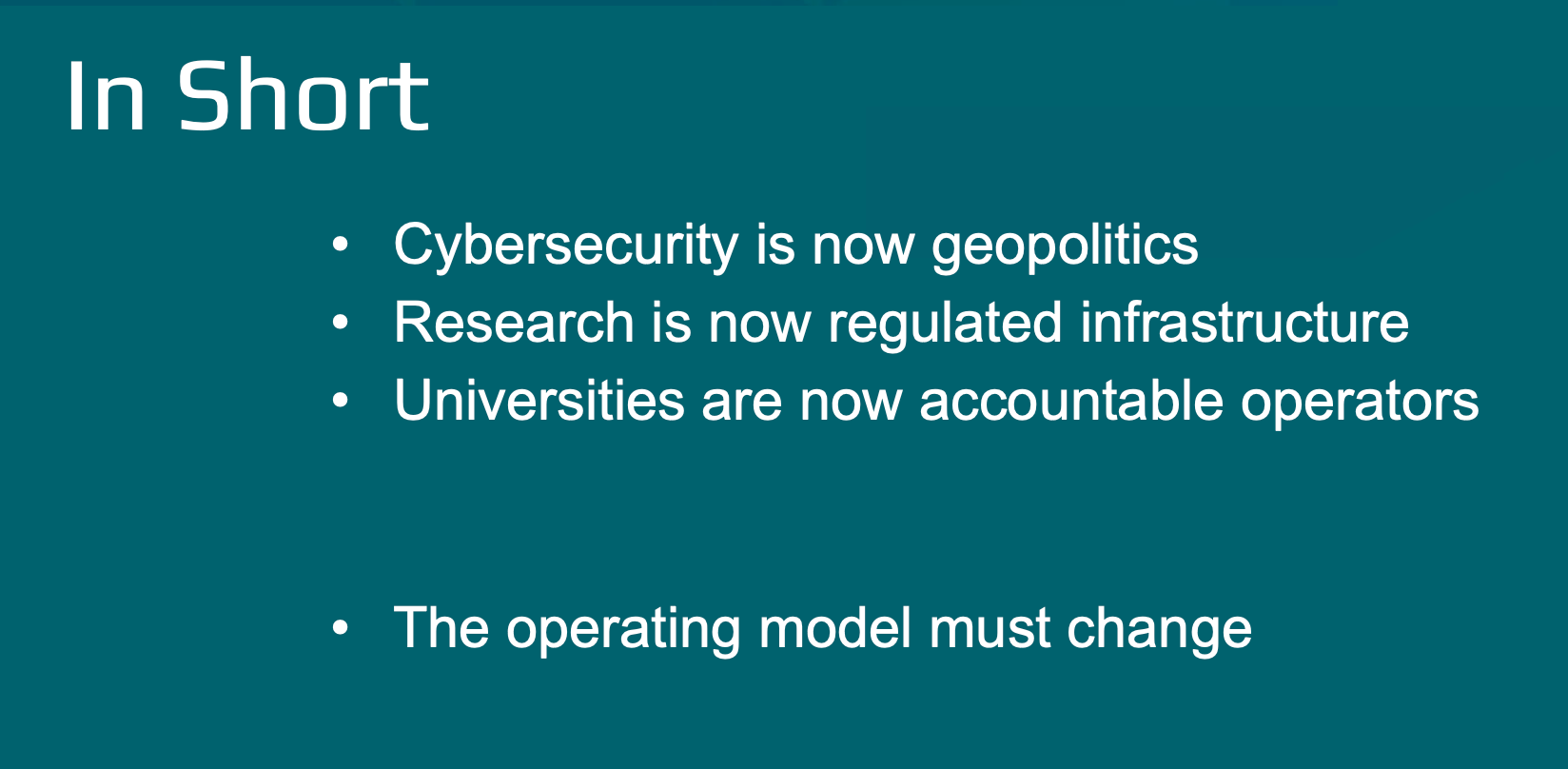 I think this discussion is ripe for revisiting at the moment, as universities begin to face the reality that it is no longer possible to operate as they traditionally have with regards to research and cybersecurity: the operating model must change. But how to do that at scale remains daunting. Especially when combined with the bootstrapping issue mentioned above. It’s likely that many institutions will take the stance that this is fundamentally a problem for researchers to solve. It’s your grant money and your lab, so you’ll need to adapt to modern cybersecurity practices and begin including those costs in your proposals. And that’s not wrong. I know federal agencies are more amenable to the inclusion of cybersecurity costs in proposals than ever before - indeed, we are entering a period where their inclusion is seen as signaling responsibility and maturity in a proposal. Which can only lead to greater likelihood of being funded successfully.