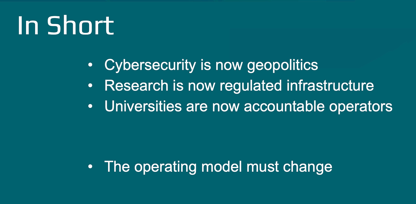But to leave the issue there - as the researcher’s problem - is both naïve and self-defeating. As the previous bullet point on my slide says, universities are now accountable operators of research infrastructure. Not only do they need researchers to succeed in obtaining funding, but they themselves are now required to certify institutional compliance with a research security program. Thus the failure of a researcher impacts not merely their own research program, but the institutional capacity to receive federal funding. Note that no other element of a research security program has as deep an operational impact in research environments as the cybersecurity component.